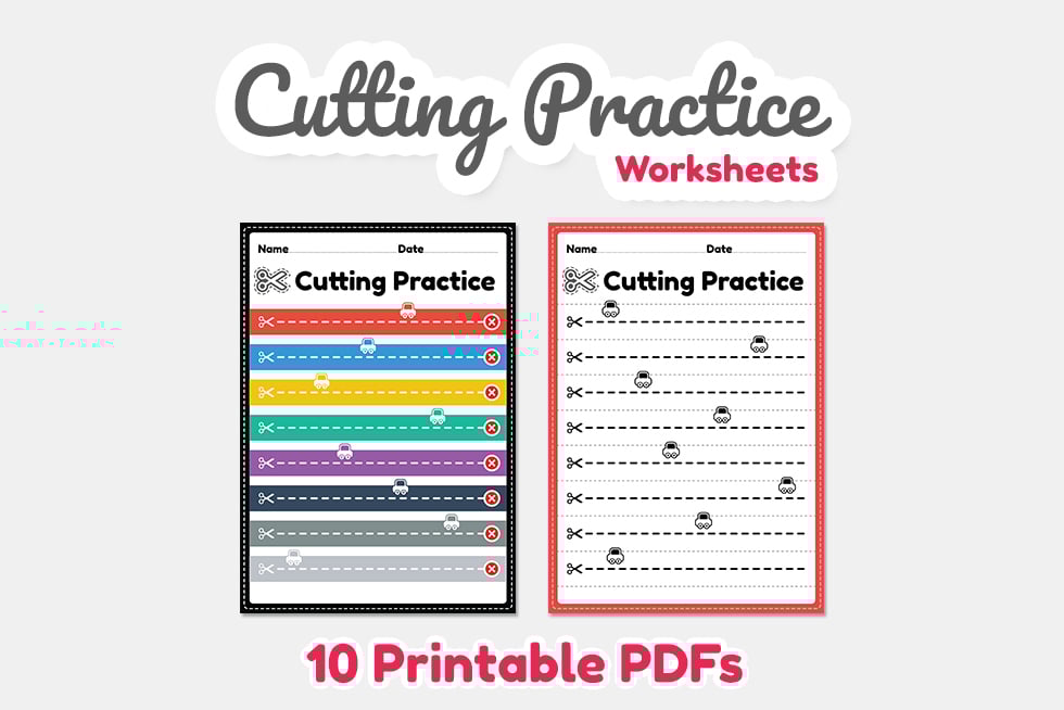 Cutting practice for kids to cut the paper with scissors to improve motor skills, coordination and develop small muscles for preschool and kindergarten children in a printable PDF pages.